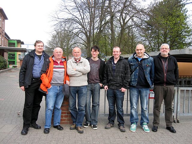 Die heute siegreiche Mannschaft des MTV „Fichte“ – nur verhalten fröhlich nach dem besiegelten Abstieg (von links Jörg Winter, Slavko Krneta, Dr. Jahns, Kristoffer Falk, Tobias Falk, Bernd Bielstein, Berthold Mitzko. Bernd Hollstein hat sich schon aus dem Staub gemacht...)