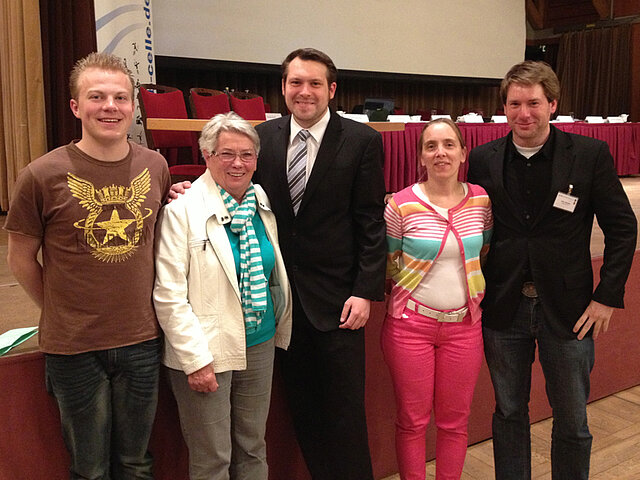 v. l.: Jugendwart Julian Liebert, Ehrenmitglied Margarethe Theye, 1. Vorsitzender Florian Hemme und Kassenwartin Stefanie Brückner neben dem Vorsitzenden der Sportjugend im KreisSportBund Felix Hemme